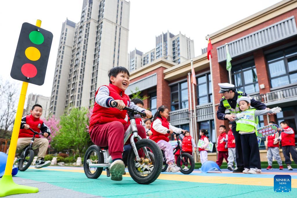 Children play a game on traffic safety at a kindergarten in Shijiazhuang City, north China's Hebei Province, March 30, 2026. March 30 marks China's national safety education day for middle and primary school students. (Photo by Liang Zidong/Xinhua)