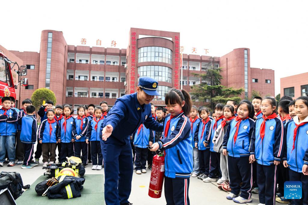 Pupils are introduced with the knowledge of using fire extinguisher at a primary school in Qinghua Town, Jiaozuo City of central China's Henan Province, March 30, 2026. March 30 marks China's national safety education day for middle and primary school students. (Photo by Cheng Quan/Xinhua)