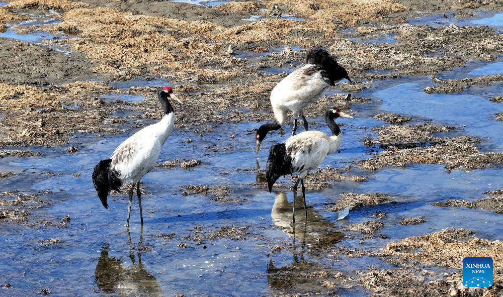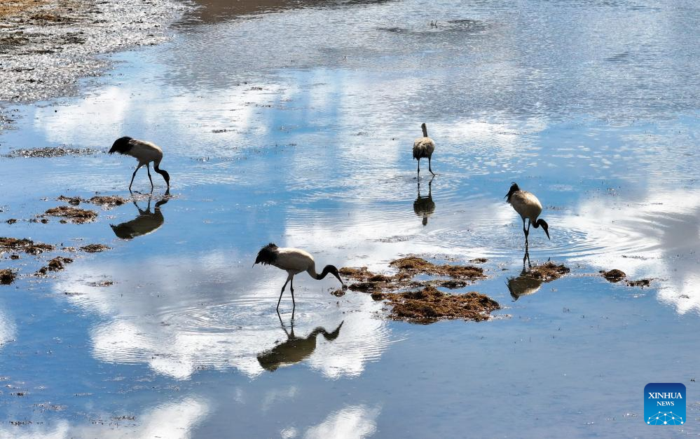 A flock of black-necked cranes forage at a river in Hongyuan County, southwest China's Sichuan Province, March 29, 2026. (Photo by Xie Hongcheng/Xinhua)