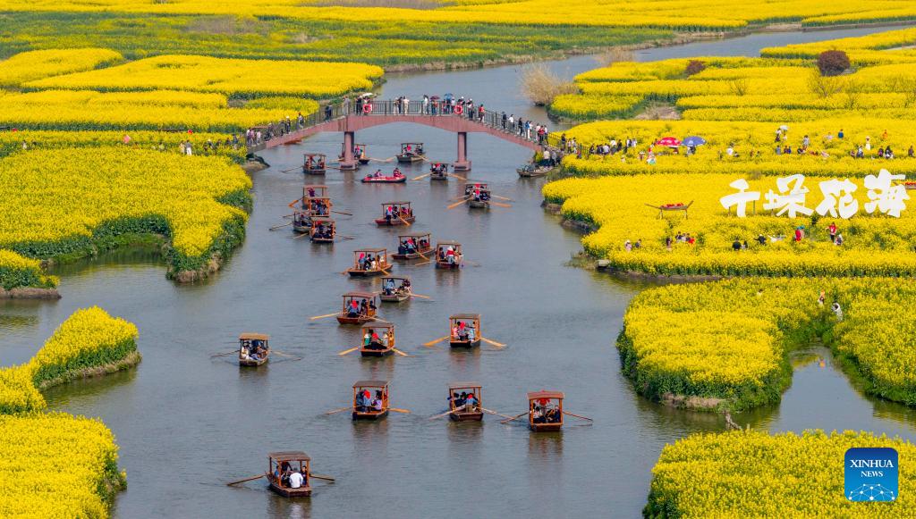 An aerial drone photo taken on March 28, 2026 shows people enjoying spring time at a scenic spot in Xinghua, east China's Jiangsu Province. (Photo by Zhou Shegen/Xinhua)
