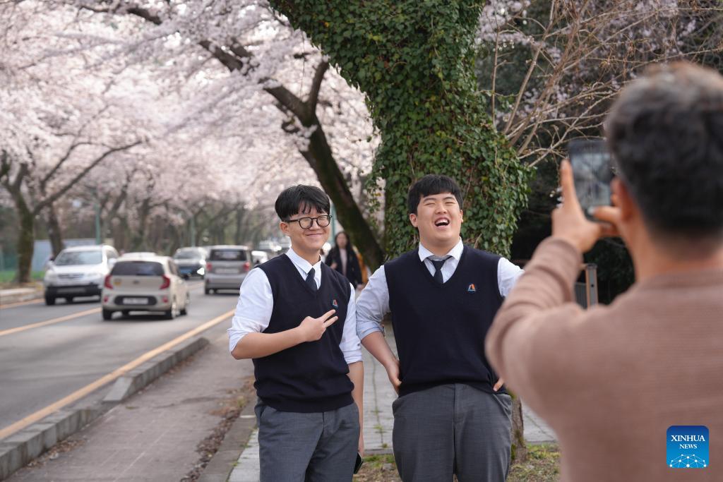 Tourists take photos with cherry blossoms along a street near Jeju National University in Jeju Island, South Korea, on March 31, 2026. (Xinhua/Zhu Hui)