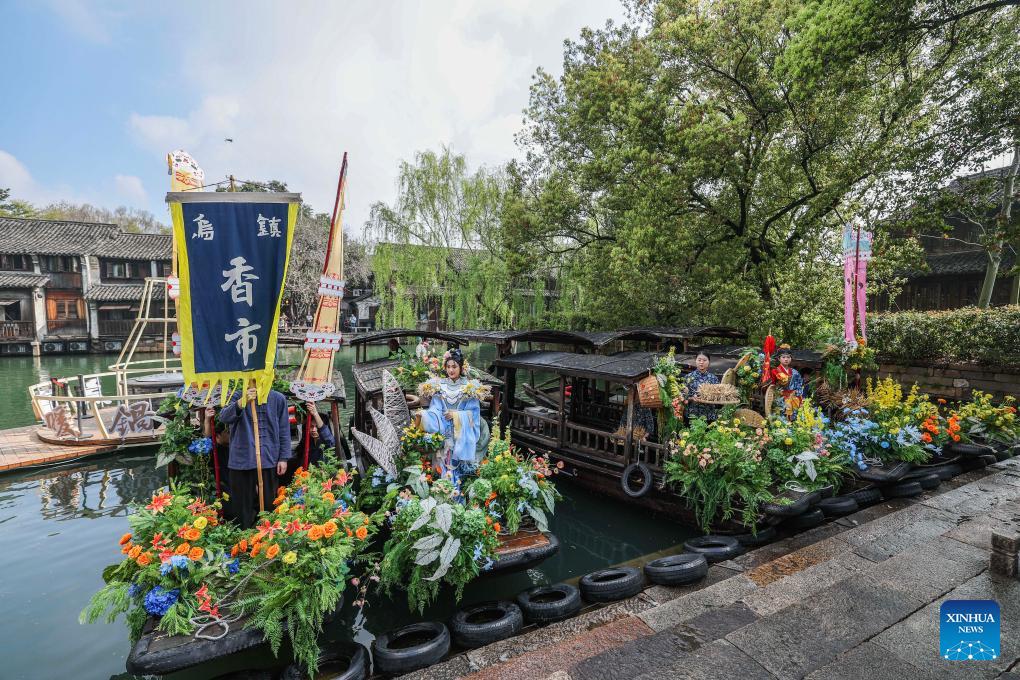A boat parade is staged during a folk fair in Wuzhen, Tongxiang City, east China's Zhejiang Province, April 1, 2026. A folk fair opened here on Wednesday, during which people can experience the atmosphere of traditional sericulture and enjoy the spring scenery through folk parades both on the street and on the water. (Xinhua/Xu Yu)