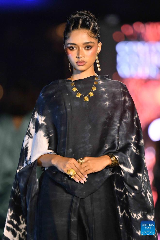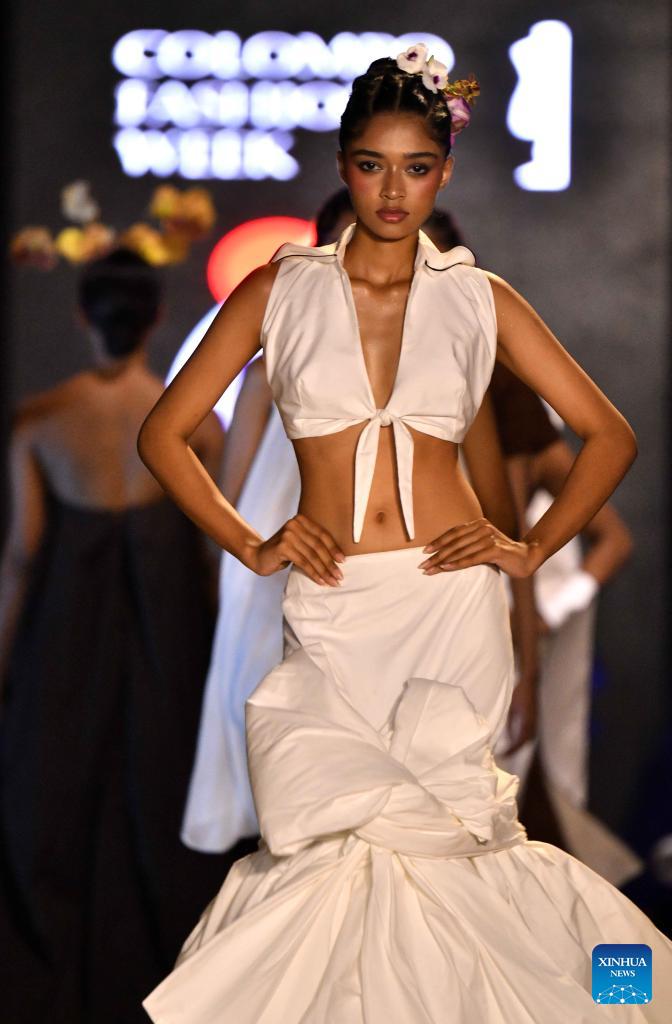 A model presents a creation during the Colombo Fashion Week in Colombo, Sri Lanka on April 1, 2026. The Colombo Fashion Week Summer 2026 takes place from April 1 to 4. The four-day event showcases creations from more than 30 designers. (Photo by Ajith Perera/Xinhua)