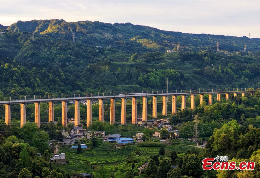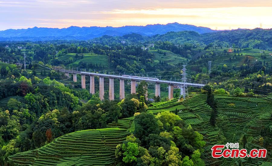 Photo taken on March 31, 2026 shows a high-speed train passing by the Changgangshan Tea Garden in Hongxing Town, Mingshan District, Ya'an City, Sichuan Province. (Photo: China News Service/An Yuan)