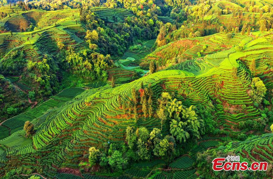 Tea bushes unfurl like the fingerprints of the earth across the Changgangshan Tea Garden in Hongxing Town, Mingshan District, Ya'an City, Sichuan Province, March 31, 2026. (Photo: China News Service/An Yuan)