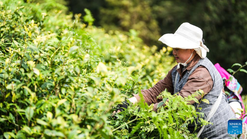 A farmer picks tea leaves on a tea mountain in Liuzhi special district of Liupanshui City, southwest China's Guizhou Province, April 2, 2026. (Xinhua/Tao Liang)