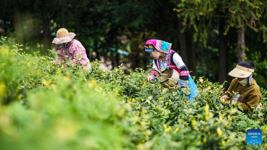 Farmers pick tea leaves on a tea mountain in Liuzhi special district of Liupanshui City, southwest China's Guizhou Province, April 2, 2026. (Xinhua/Tao Liang)