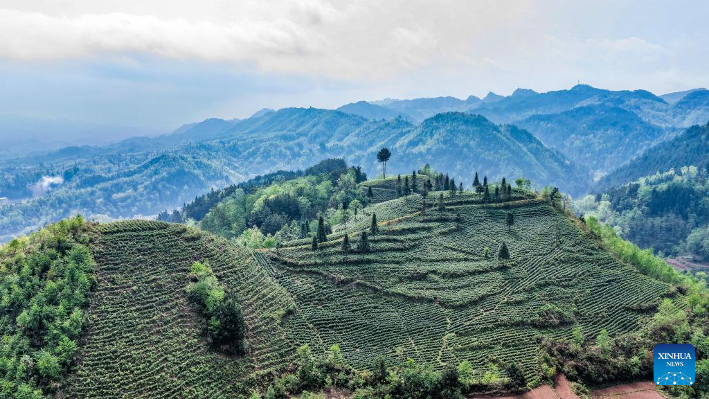 An aerial drone photo taken on April 2, 2026 shows the scenery of a tea mountain in Liuzhi special district of Liupanshui City, southwest China's Guizhou Province. (Xinhua/Tao Liang)