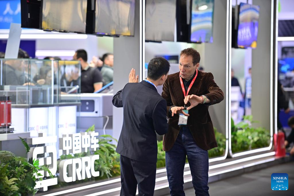Visitors learn about the flexible green power hydrogen product solution of China Railway Rolling Stock Corporation (CRRC) during the 14th Energy Storage International Conference and Expo (ESIE) at the Capital International Exhibition &Convention Center in Beijing, capital of China, April 2, 2026. The 14th ESIE, featuring six themed exhibition pavilions, opens from March 31 to April 3. (Xinhua/Yin Dongxun)