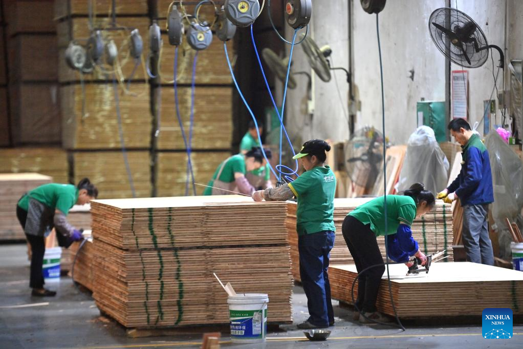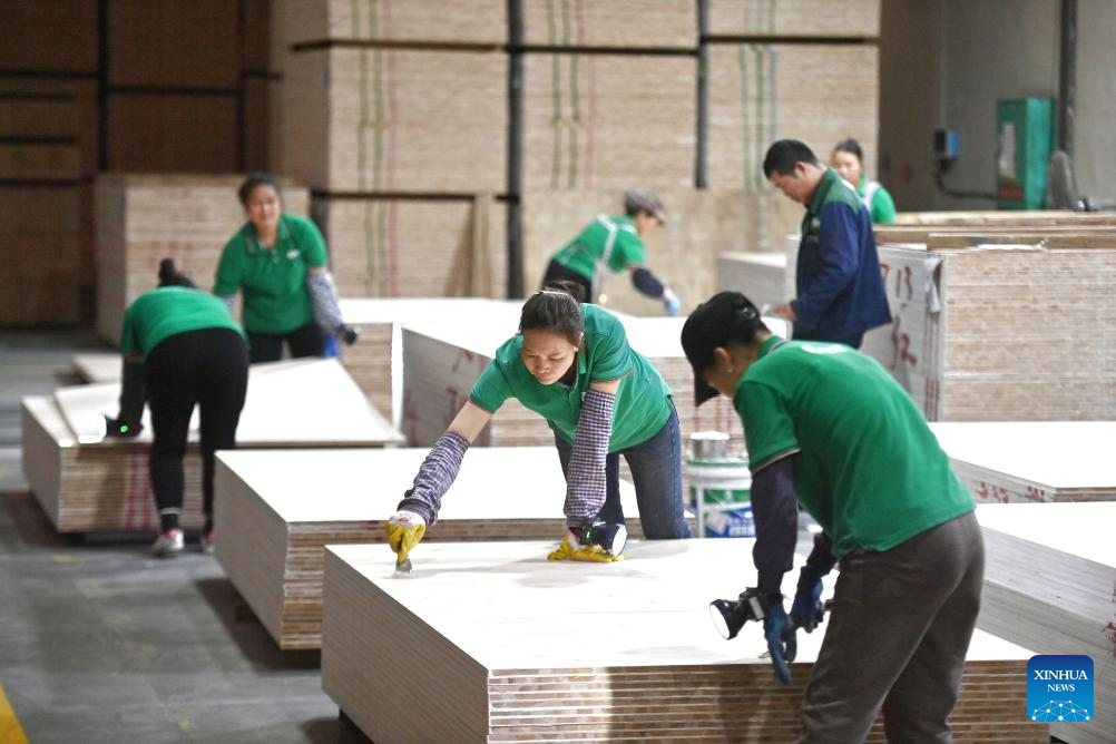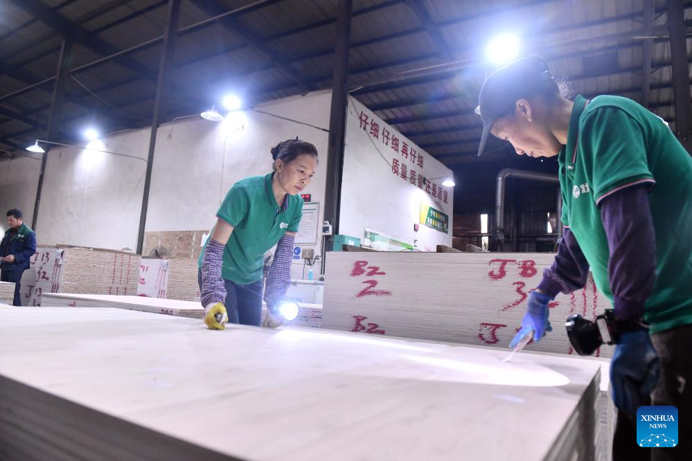 Workers operate on a production line at a board production factory in Rong'an County of Liuzhou City, south China's Guangxi Zhuang Autonomous Region, April 1, 2026. In recent years, Rong'an County has leveraged its high-quality resources of Chinese fir to drive rural revitalization. Through integrating seedling cultivation, planting, timber processing and rural tourism, the Chinese fir-related industry has emerged as a pillar sector in Rong'an, creating more than 20,000 jobs for local residents. (Xinhua/Huang Xiaobang)
