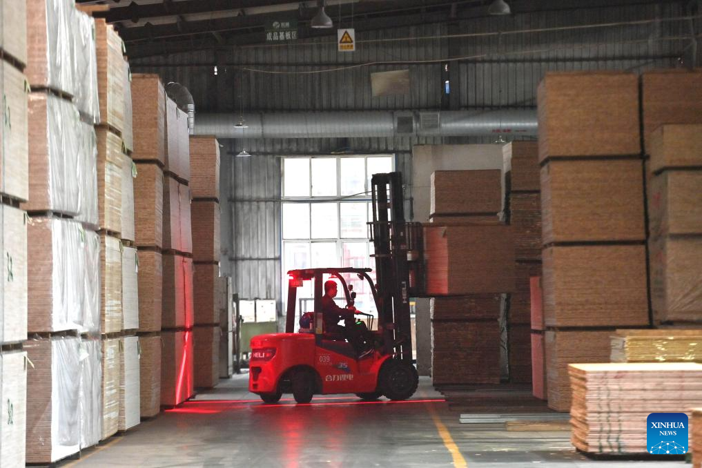 A worker works at a board production factory in Rong'an County of Liuzhou City, south China's Guangxi Zhuang Autonomous Region, April 1, 2026. In recent years, Rong'an County has leveraged its high-quality resources of Chinese fir to drive rural revitalization. Through integrating seedling cultivation, planting, timber processing and rural tourism, the Chinese fir-related industry has emerged as a pillar sector in Rong'an, creating more than 20,000 jobs for local residents. (Xinhua/Huang Xiaobang)