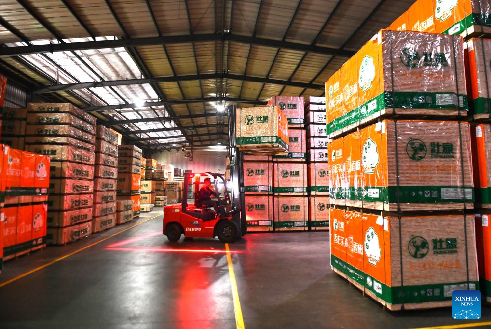 A worker drives a forklift to transfer Chinese fir boards at a board production factory in Rong'an County of Liuzhou City, south China's Guangxi Zhuang Autonomous Region, April 1, 2026. In recent years, Rong'an County has leveraged its high-quality resources of Chinese fir to drive rural revitalization. Through integrating seedling cultivation, planting, timber processing and rural tourism, the Chinese fir-related industry has emerged as a pillar sector in Rong'an, creating more than 20,000 jobs for local residents. (Xinhua/Huang Xiaobang)