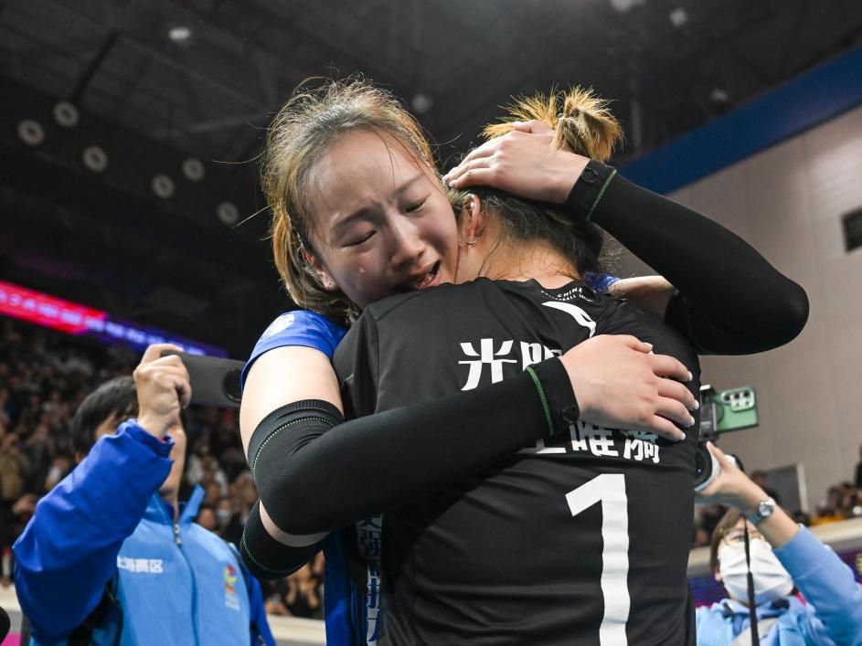Zhong Hui (L) of Shanghai hugs teammate Wang Weiyi after the third round match between Shanghai and Jiangsu at the 2025-2026 China Volleyball League Big Final in Shanghai on April 1, 2026. (Photo: Xinhua)