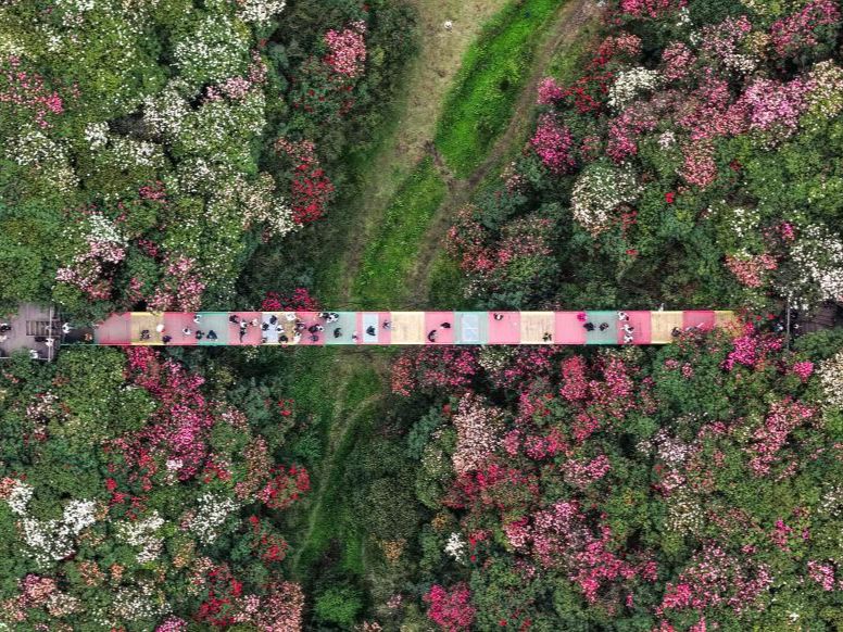 An aerial drone photo shows tourists visiting an azalea scenic area in Bijie City, Southwest China's Guizhou Province, April 1, 2026. The azaleas in Bijie are currently in full bloom, drawing crowds of visitors. (Photo: Xinhua)