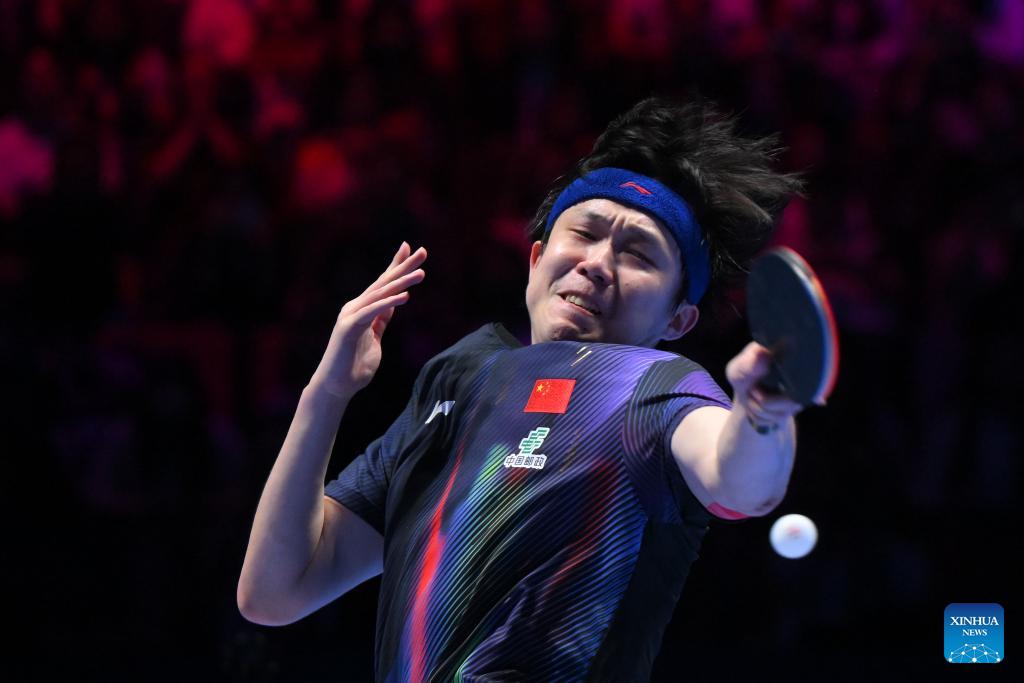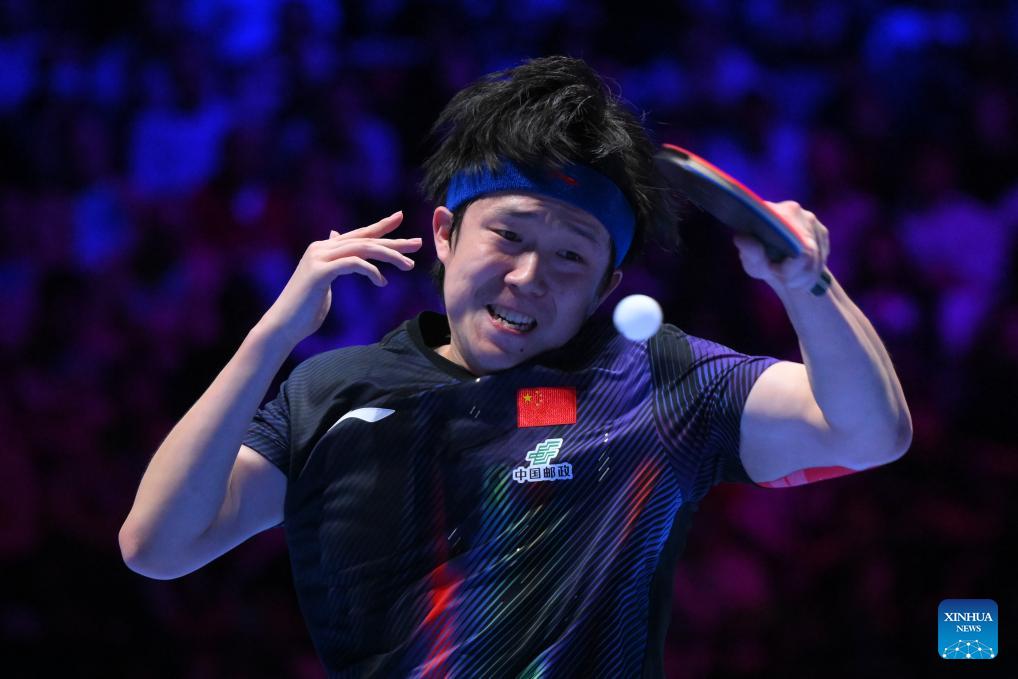 Wang Chuqin hits a return during the men's singles final match between Wang Chuqin of China and Matsushima Sora of Japan at the ITTF Men's and Women's World Cup 2026 in Macao, China, April 5, 2026. (Xinhua/Cheong Kam Ka)