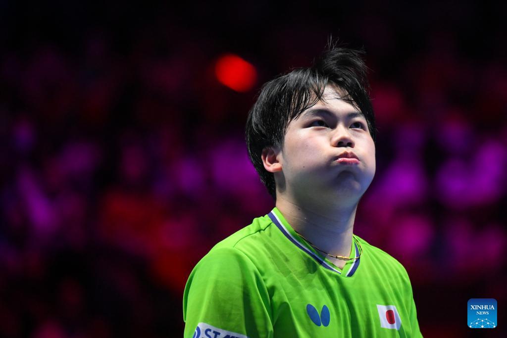 Matsushima Sora reacts during the men's singles final match between Wang Chuqin of China and Matsushima Sora of Japan at the ITTF Men's and Women's World Cup 2026 in Macao, China, April 5, 2026. (Xinhua/Cheong Kam Ka)