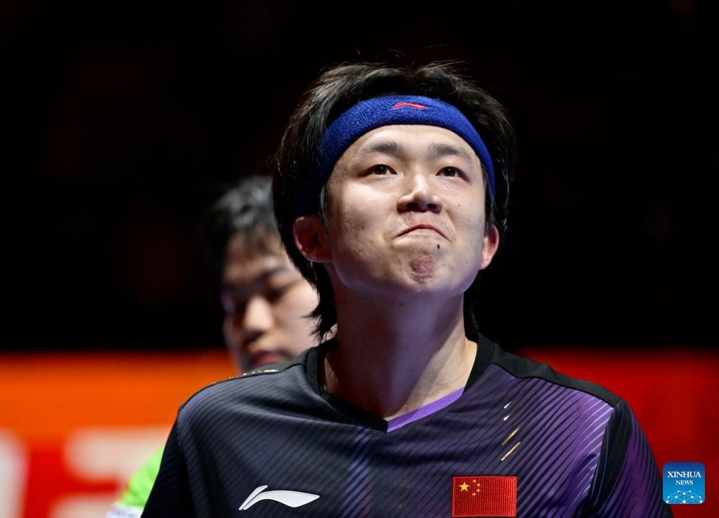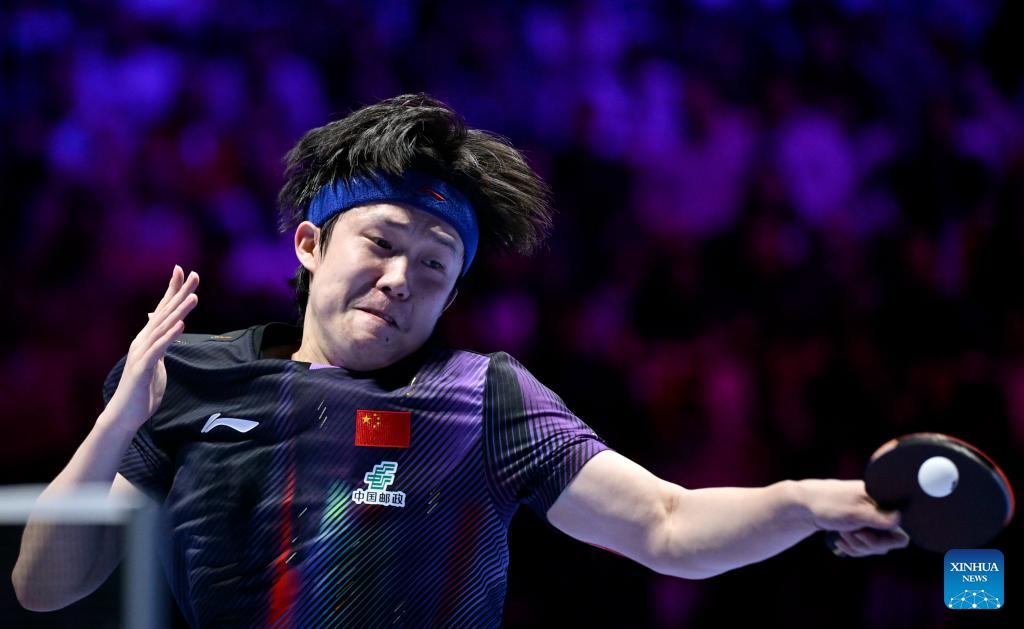 Wang Chuqin hits a return during the men's singles final match between Wang Chuqin of China and Matsushima Sora of Japan at the ITTF Men's and Women's World Cup 2026 in Macao, China, April 5, 2026. (Xinhua/Yu Yang)