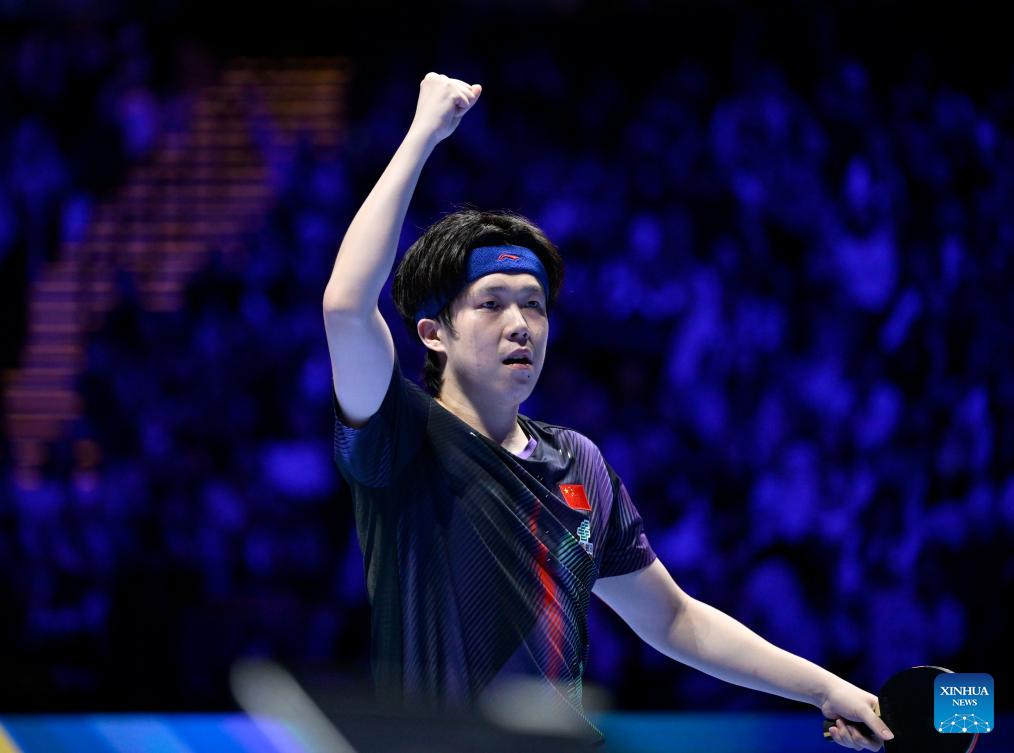 Wang Chuqin celebrates during the men's singles final match between Wang Chuqin of China and Matsushima Sora of Japan at the ITTF Men's and Women's World Cup 2026 in Macao, China, April 5, 2026. (Xinhua/Yu Yang)
