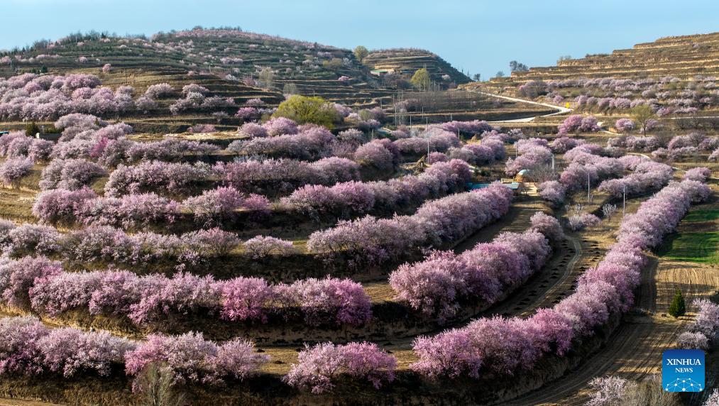An aerial drone photo taken on April 5, 2026 shows a view of flowers at the Jinjiping terraced field park in Pengyang County, Guyuan City of northwest China's Ningxia Hui Autonomous Region. Spring flowers here are in full blossom during the Qingming Festival holiday, attracting many tourists. (Xinhua/Wang Peng)