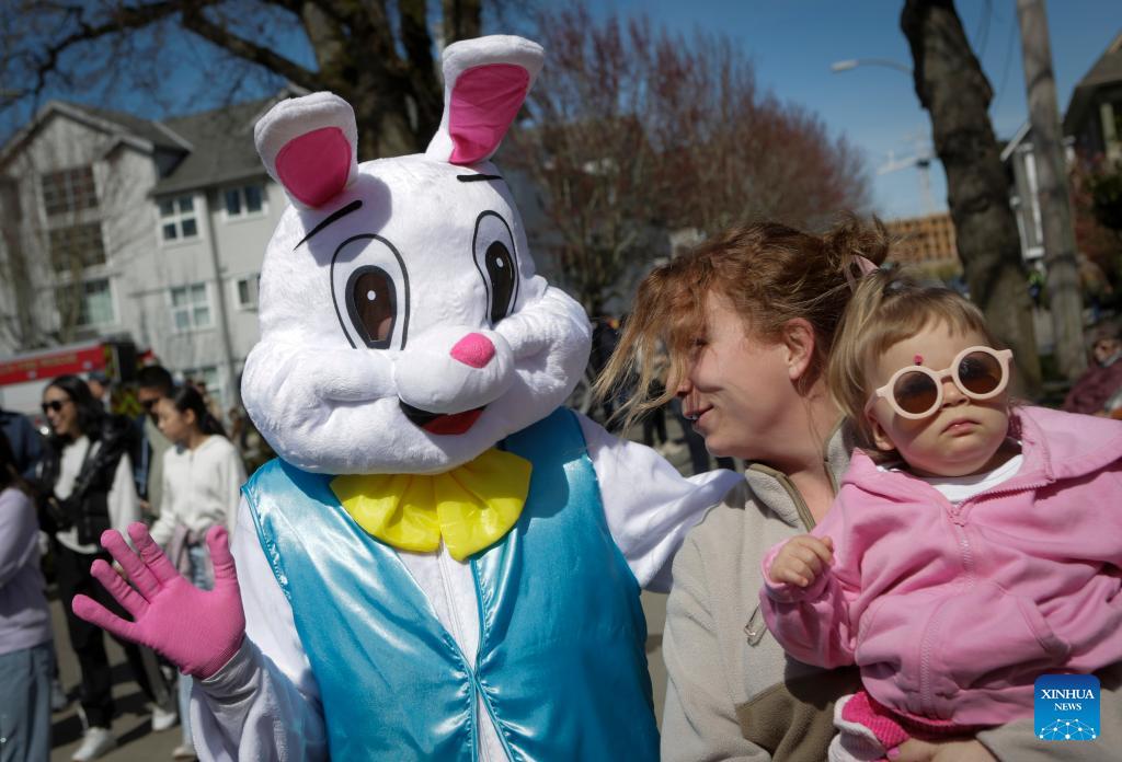 A performer dressed as the Easter Bunny interacts with people during the annual Easter Parade at Ladner Village in Delta, British Columbia, Canada, on April 5, 2026. The annual Easter event, a community tradition of more than 60 years, featured a festive parade and family-oriented activities, drawing local residents to celebrate the holiday. (Photo by Liang Sen/Xinhua)