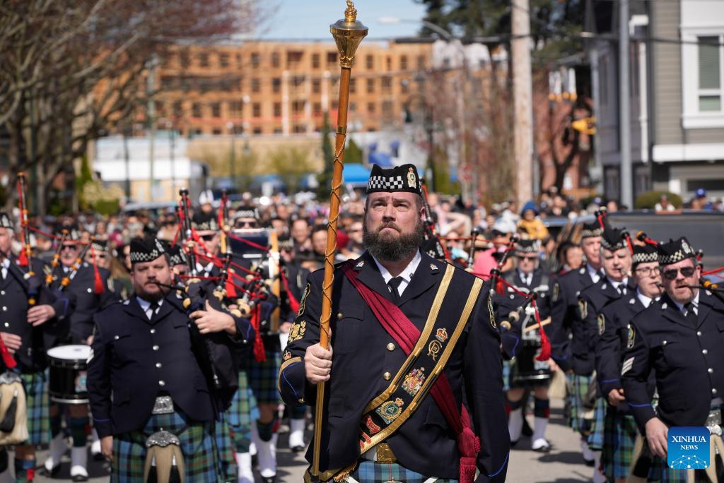 Members of a police pipe band perform during the annual Easter Parade at Ladner Village in Delta, British Columbia, Canada, on April 5, 2026. The annual Easter event, a community tradition of more than 60 years, featured a festive parade and family-oriented activities, drawing local residents to celebrate the holiday. (Photo by Liang Sen/Xinhua)