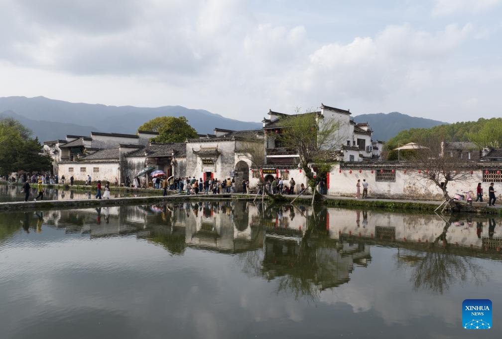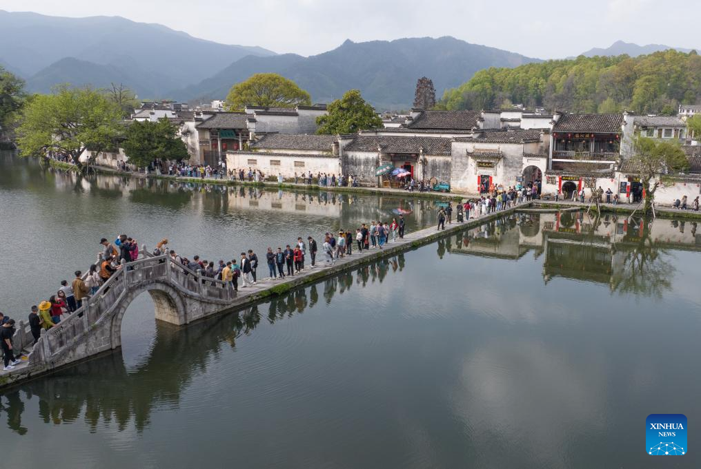An aerial drone photo taken on April 4, 2026 shows visitors enjoying the scenery during the Qingming Festival holiday at Hongcun Village, Yixian County of Huangshan City, east China's Anhui Province. (Xinhua/Du Yu)