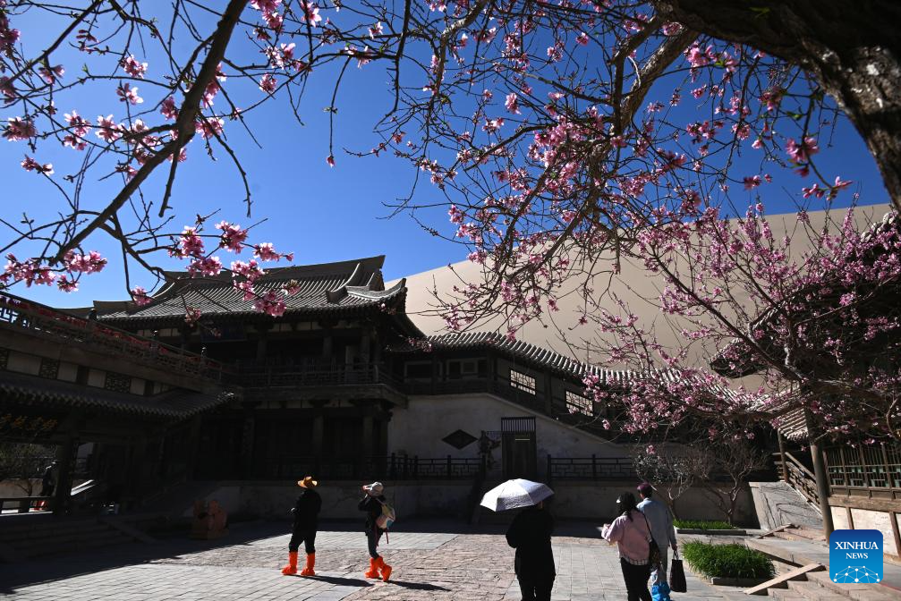 Tourists visit the Mingsha Mountain and Crescent Spring Scenic Area during the Qingming Festival holiday in Dunhuang City, northwest China's Gansu Province, April 5, 2026. (Photo by Zhang Xiaoliang/Xinhua)