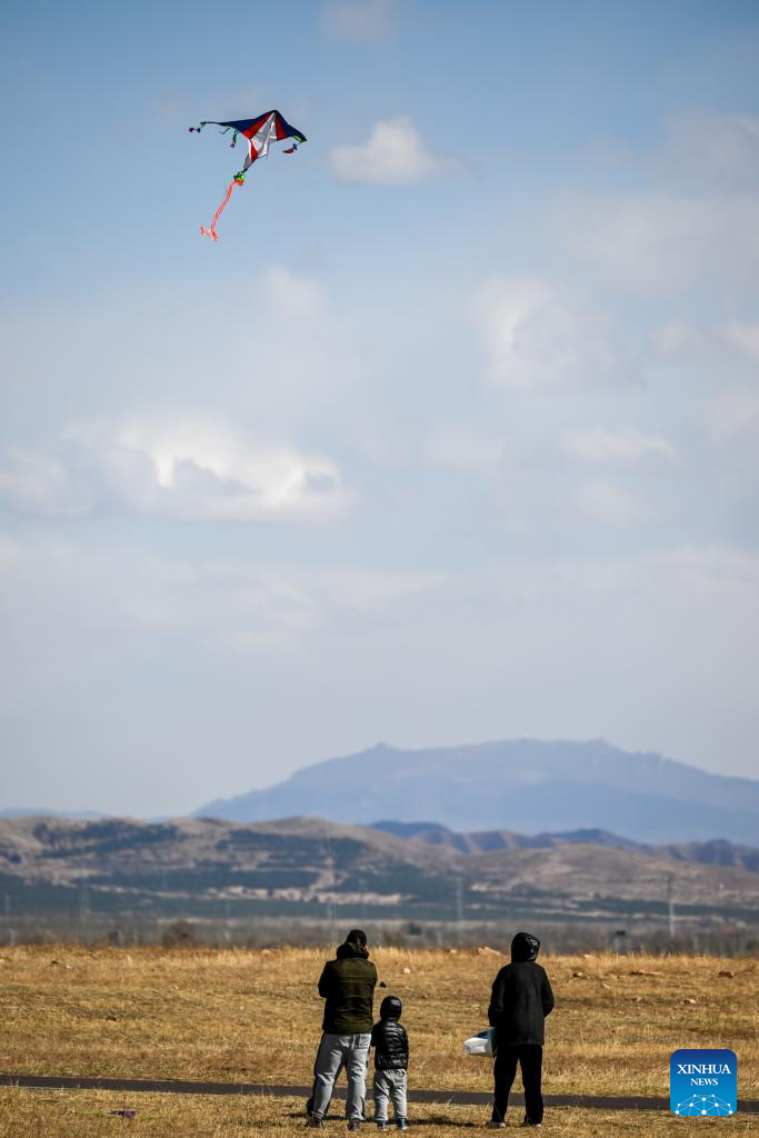 Tourists fly a kite during the Qingming Festival holiday at a grassland in Hohhot, north China's Inner Mongolia Autonomous Region, April 5, 2026. (Xinhua/Lian Zhen)