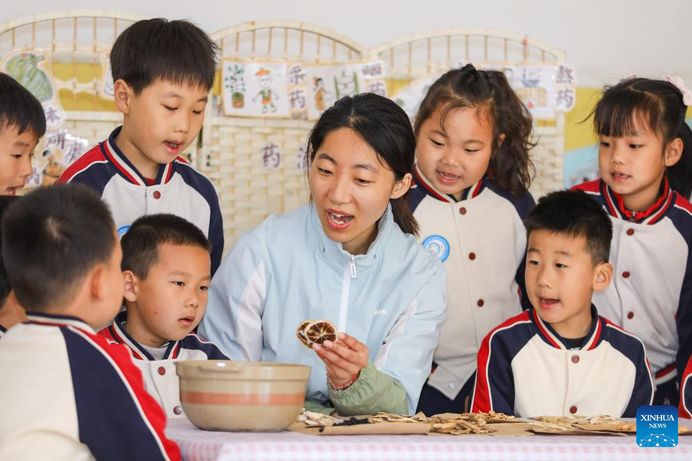 A teacher teaches the children to recognize traditional Chinese medicinal herbs at a kindergarten in Qingdao, east China's Shandong Province, April 7, 2026. The World Health Day is observed annually on April 7, which marks the anniversary of the WHO's founding and raises awareness of pressing global health issues. (Photo by Zhang Ying/Xinhua)