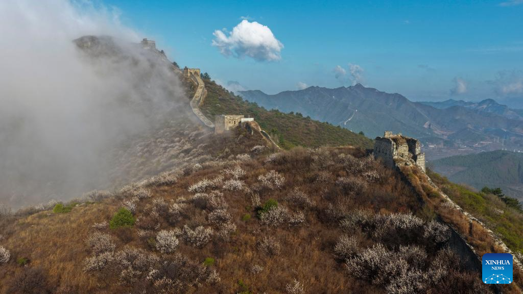 An aerial drone photo taken on April 10, 2026 shows a section of ancient Great Wall after rain in Qian'an City of north China's Hebei Province. (Photo by Liu Mancang/Xinhua)
