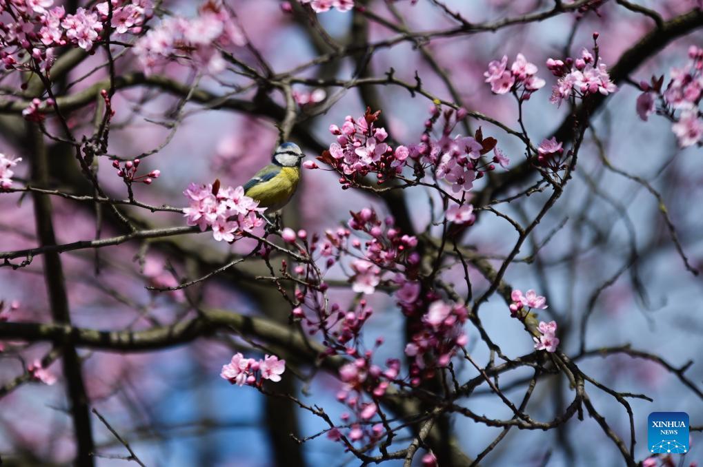 A bird perches on a cherry branch in Warsaw, Poland on April 10, 2026. (Photo by Aleksy Witwicki/Xinhua)