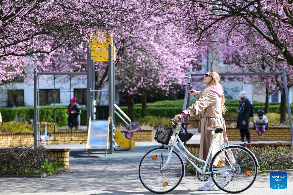 A pedestrian takes photos under blooming cherry trees in Warsaw, Poland, on April 10, 2026. (Photo by Aleksy Witwicki/Xinhua)