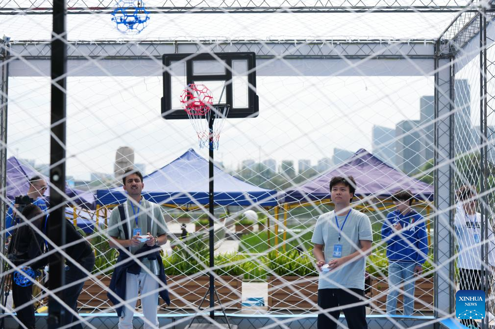 Competitors test drones before the drone basketball event during a drone sports meeting which combines technology and competitive sports in Chengdu, southwest China's Sichuan Province, April 11, 2026. (Xinhua/Xu Bingjie)