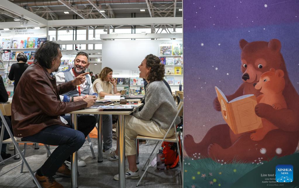 Visitors watch the illustrations during the 63rd Bologna Children's Book Fair in Bologna, Italy, April 13, 2026. The 63rd Bologna Children's Book Fair opened on Monday in the Italian city of Bologna. (Xinhua/Wang Kaiyan)