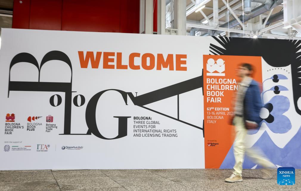 A visitor walks past the official poster of the 63rd Bologna Children's Book Fair in Bologna, Italy, April 13, 2026. The 63rd Bologna Children's Book Fair opened on Monday in the Italian city of Bologna. (Xinhua/Wang Kaiyan)