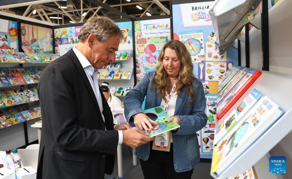 An exhibitor introduces a book to a visitor during the 63rd Bologna Children's Book Fair in Bologna, Italy, April 13, 2026. The 63rd Bologna Children's Book Fair opened on Monday in the Italian city of Bologna. (Xinhua/Wang Kaiyan)
