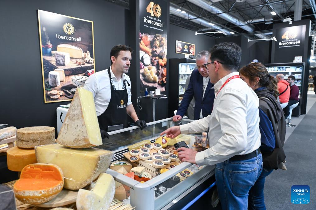 (260413) -- MADRID, April 13, 2026 (Xinhua) -- A visitor talks to a cheese exhibitor during the Salon Gourmets in Madrid, Spain, on April 13, 2026. The 39th Salon Gourmets will run in Madrid from April 13 to 16. (Photo by Gustavo Valiente/Xinhua)