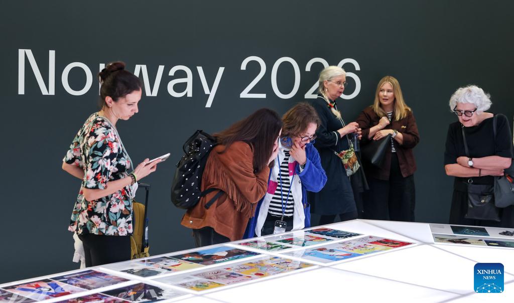 Visitors visit the exhibition area of the Guest of Honour Norway during the 63rd Bologna Children's Book Fair in Bologna, Italy, April 13, 2026. The 63rd Bologna Children's Book Fair opened on Monday in the Italian city of Bologna. (Xinhua/Wang Kaiyan)