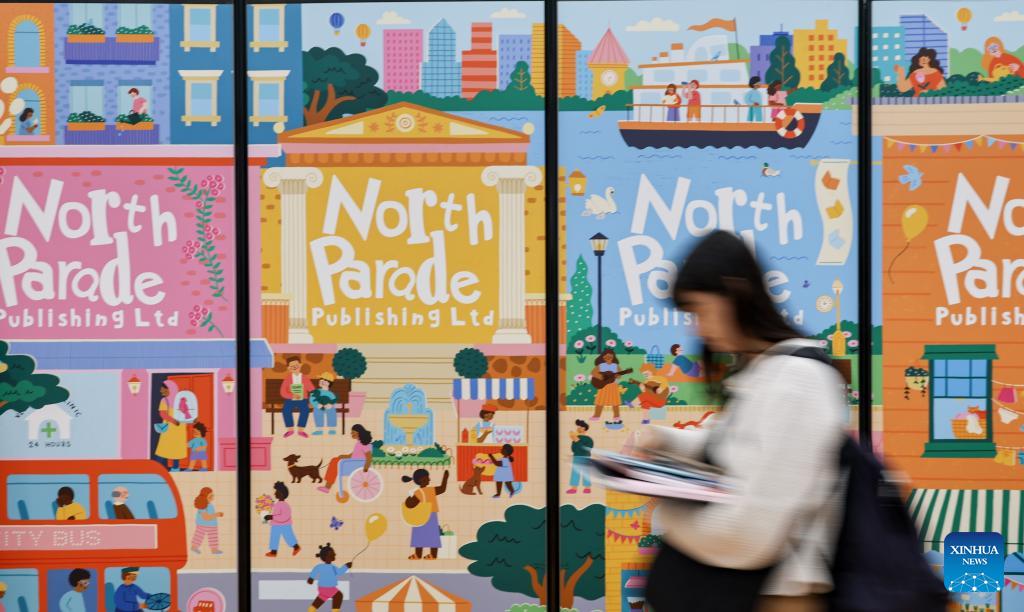 A visitor walks past posters during the 63rd Bologna Children's Book Fair in Bologna, Italy, April 13, 2026. The 63rd Bologna Children's Book Fair opened on Monday in the Italian city of Bologna. (Xinhua/Wang Kaiyan)