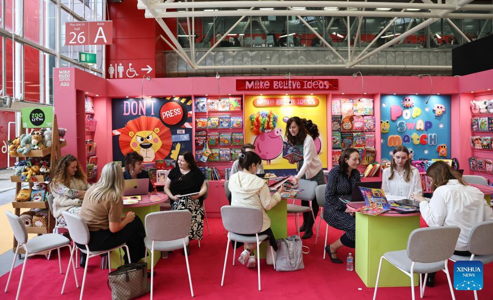 Exhibitors communicate with visitors during the 63rd Bologna Children's Book Fair in Bologna, Italy, April 13, 2026. The 63rd Bologna Children's Book Fair opened on Monday in the Italian city of Bologna. (Xinhua/Wang Kaiyan)