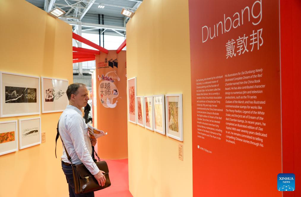 A visitor checks the Chinese exhibition area during the 63rd Bologna Children's Book Fair in Bologna, Italy, April 13, 2026. The 63rd Bologna Children's Book Fair opened on Monday in the Italian city of Bologna. (Xinhua/Wang Kaiyan)