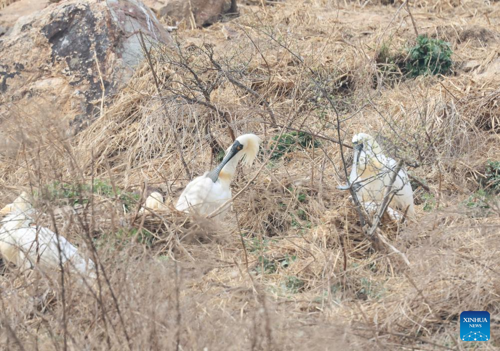 Black-faced spoonbills rest in their nests on a cliff in Shicheng Township of Zhuanghe City, northeast China's Liaoning Province, April 14, 2026. Every year in mid-to-late March, black-faced spoonbills set off from their wintering grounds and migrate northward to Zhuanghe City, where they engage in courtship, nesting and chick-raising activities. (Xinhua/Han He)