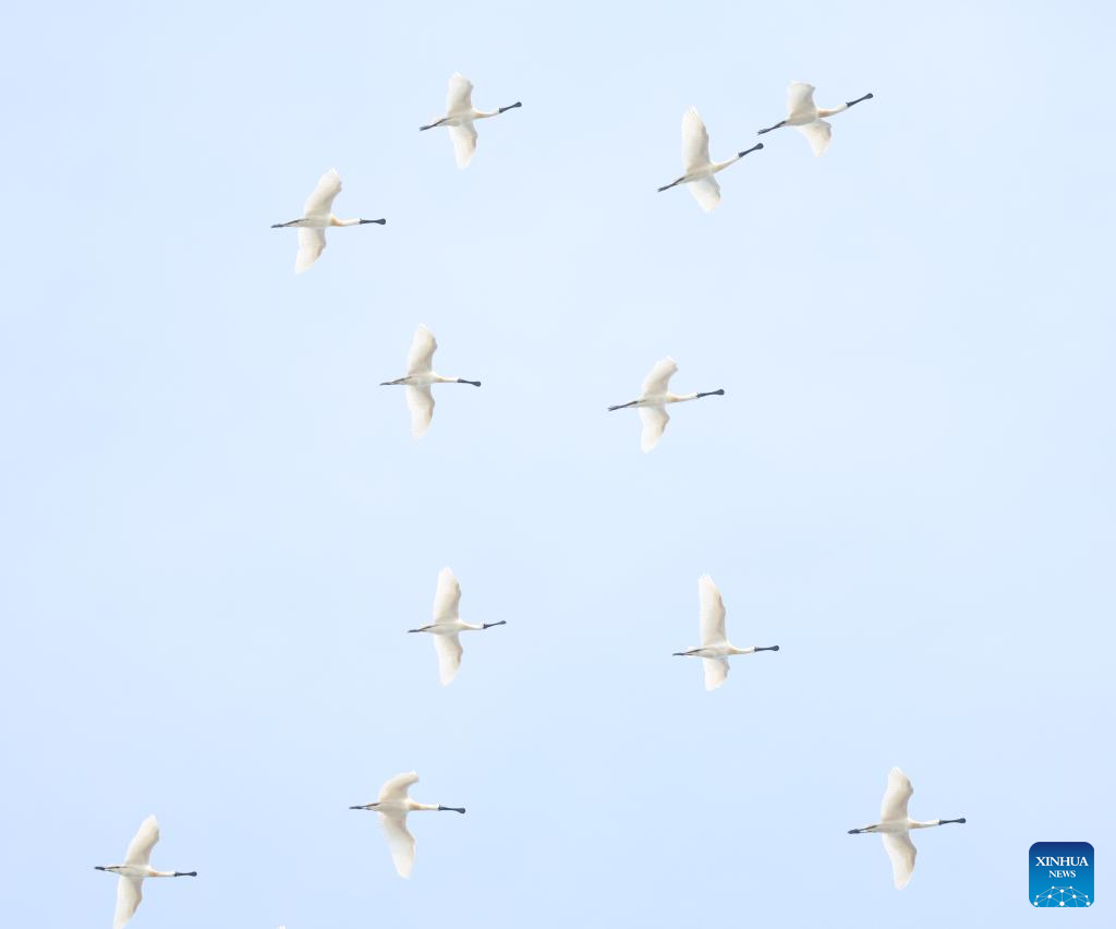A flock of black-faced spoonbills fly in the sky over Shicheng Township of Zhuanghe City, northeast China's Liaoning Province, April 14, 2026. Every year in mid-to-late March, black-faced spoonbills set off from their wintering grounds and migrate northward to Zhuanghe City, where they engage in courtship, nesting and chick-raising activities. (Xinhua/Han He)