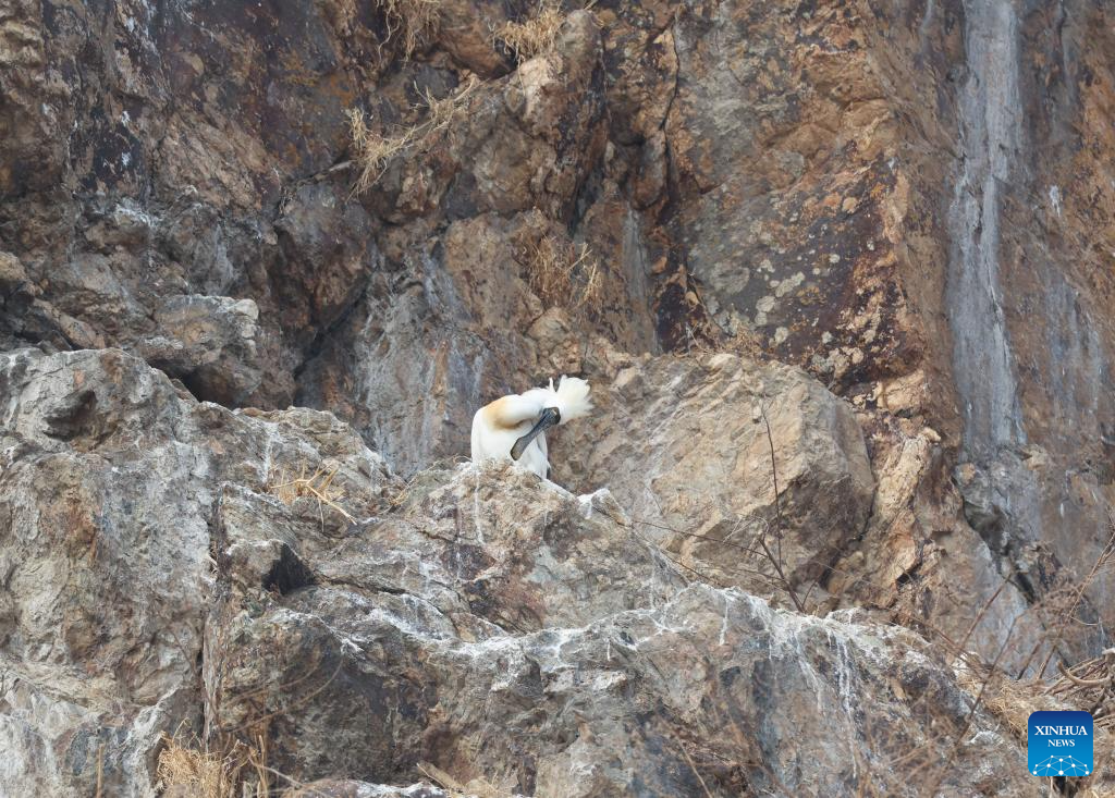 A black-faced spoonbill preens its feathers on a cliff in Shicheng Township of Zhuanghe City, northeast China's Liaoning Province, April 14, 2026. Every year in mid-to-late March, black-faced spoonbills set off from their wintering grounds and migrate northward to Zhuanghe City, where they engage in courtship, nesting and chick-raising activities. (Xinhua/Han He)
