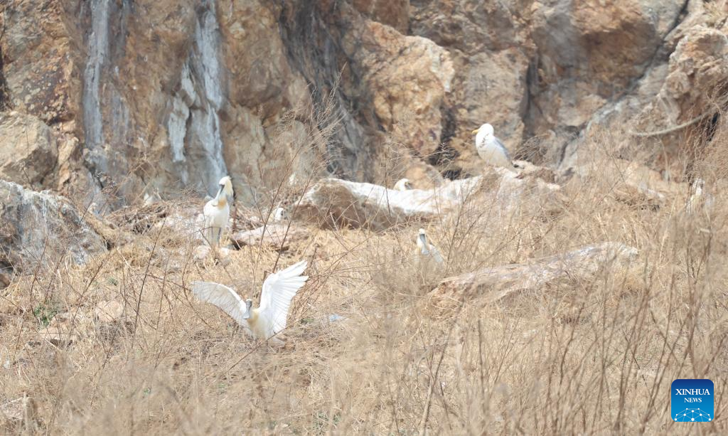 Black-faced spoonbills and seagulls perch on a cliff in Shicheng Township of Zhuanghe City, northeast China's Liaoning Province, April 14, 2026. Every year in mid-to-late March, black-faced spoonbills set off from their wintering grounds and migrate northward to Zhuanghe City, where they engage in courtship, nesting and chick-raising activities. (Xinhua/Han He)