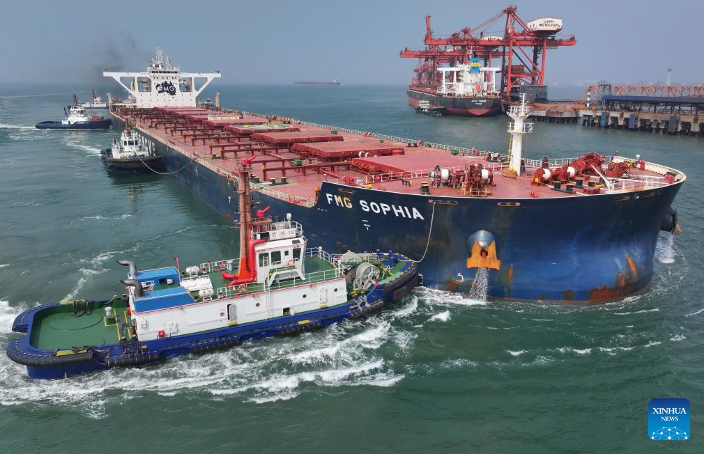 A drone photo taken on April 15, 2026 shows workers preparing a vessel for departure at the ore terminal of Caofeidian Port Area in Tangshan Port in Tangshan, north China's Hebei Province. From January to March this year, Caofeidian Port Area handled a cargo throughput of 138.03 million tonnes, marking a year-on-year increase of 3.16 percent. (Xinhua/Yang Shiyao)