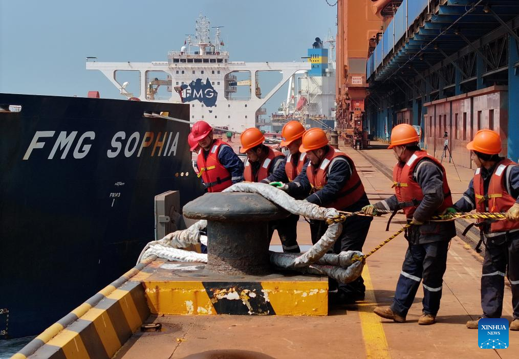 A drone photo taken on April 15, 2026 shows workers securing mooring lines to a vessel docking at the ore terminal of Caofeidian Port Area in Tangshan Port in Tangshan, north China's Hebei Province. From January to March this year, Caofeidian Port Area handled a cargo throughput of 138.03 million tonnes, marking a year-on-year increase of 3.16 percent. (Xinhua/Yang Shiyao)