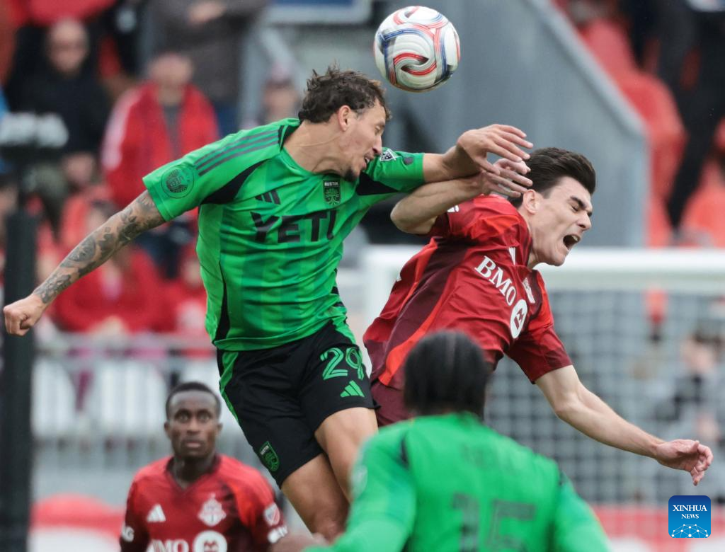 Alonso Coello (R, top) of Toronto FC vies with Guilherme Biro of Austin FC during the 2026 Major League Soccer (MLS) regular season match between Toronto FC and Austin FC at BMO Field in Toronto, Canada, April 18, 2026. (Photo by Zou Zheng/Xinhua)