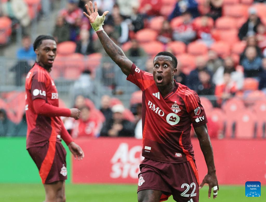Richie Laryea (R) of Toronto FC reacts during the 2026 Major League Soccer (MLS) regular season match between Toronto FC and Austin FC at BMO Field in Toronto, Canada, April 18, 2026. (Photo by Zou Zheng/Xinhua)