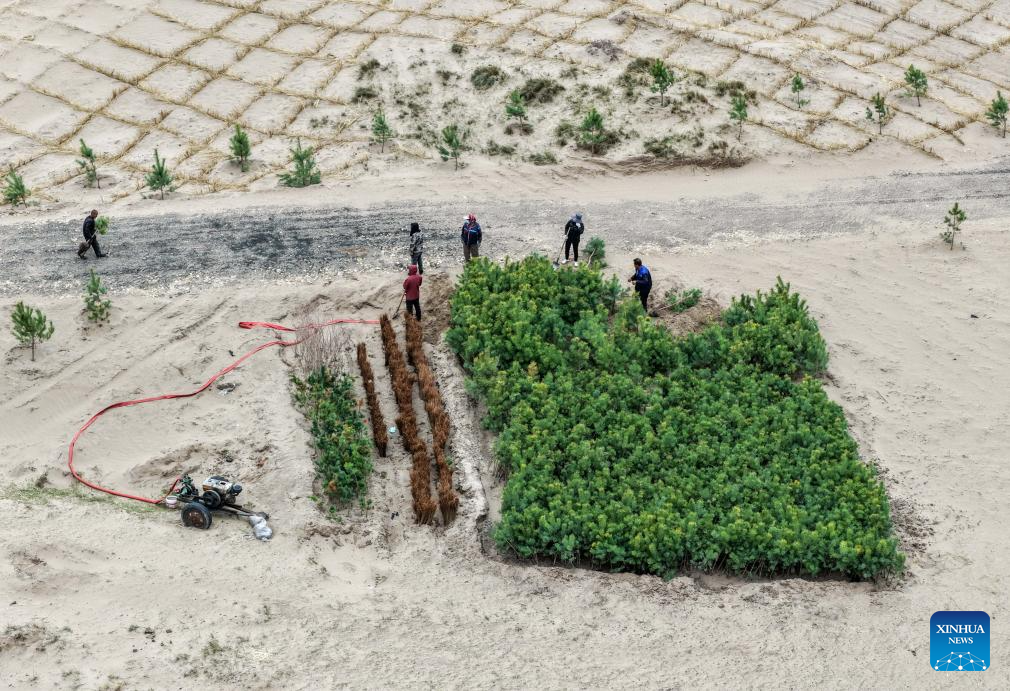 Workers plant trees at an anti-desertification project area in Horqin Left Wing Rear Banner of Tongliao City, north China's Inner Mongolia Autonomous Region, April 19, 2026. The sandy area of this project is nearly 3,000 mu (200 hectares), which is the last mobile and semi-mobile sandy land to be treated in Horqin Left Rear Banner. (Xinhua/Lian Zhen)